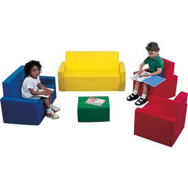 Parlor Seating Group?A Living Area Furnished To Your Kids SpecificationsPlace this cheerfully colored set in the corner of your playroom or basement and your little kids will have the perfect spot to relax whenever they yearn for a bit of quiet time. This set is manufactured solely of foam and therefore has no hard wood edges or staples that can lessen the comfort. Each piece is covered with a durable vinyl which is made to withstand rough usage, however the attractive leather like look boasts a softness usually associated with textiles. Perfect to relax on after a long day at school or a busy day of play.