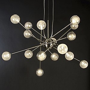 Galaxia Chandelier by Trend Lighting?Like the infinite sparkling glow of a far away galaxy, the Trend Lighting Galaxia Chandelier sheds its otherworldly light. At either end of the asymmetrically arranged bars of the frame, sixteen clear glass spheres orbit around that of the central metal sphere. These globes sparkle ethereally with the light refracted by their spun filament interiors.Planted and nurtured in a California basement more than 20 years ago, and founded on the principles of quality and innovation, Trend Lighting has grown